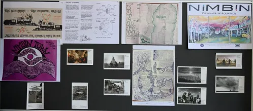Katie Cawcutt (NAFI) loaned a series of display books of archives of Nimbin Aquarius anniversary events, which she assembled with volunteer Tess Schofield. She also loaned the Nimbinnovations exhibition from the 40th anniversary celebrations curated by Graham Irvine, and a collection of laminated photos of the 1973 festival by Gary Opit. This collection was the largest component of the Archives at Aquarius50, filling wall space as other archives were printed for display.