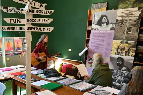 Every day of Aquarius50, Franca Wolfe attended the Aquarius Archive space as a volunteer. Franca also volunteered for the Friends of Aquarius50 organising group before and after Aquarius50. For the Archives at Aquarius50 Franca arranged to loan a replica of the well-known signpost from the 1973 festival that was made for the Nimbin Visitors’ Centre (since closed), along with two large display boards with photos and stories describing the 1973 festival to visitors.