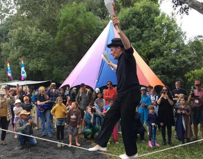 In between, high wire artist Philippe Petit – who was at the Nimbin Aquarius Festival of 1973 – juggled and walked a slack line and mimed his way to our hearts; Nimbin songsters Bikko and Doug danced us to the end of love; while Mic Conway took the piss out of mankind’s civilisational pretensions in typical Aussie fashion, by calling out a race to get to the finish line of nuclear Armageddon, with the cockroaches clear winners.